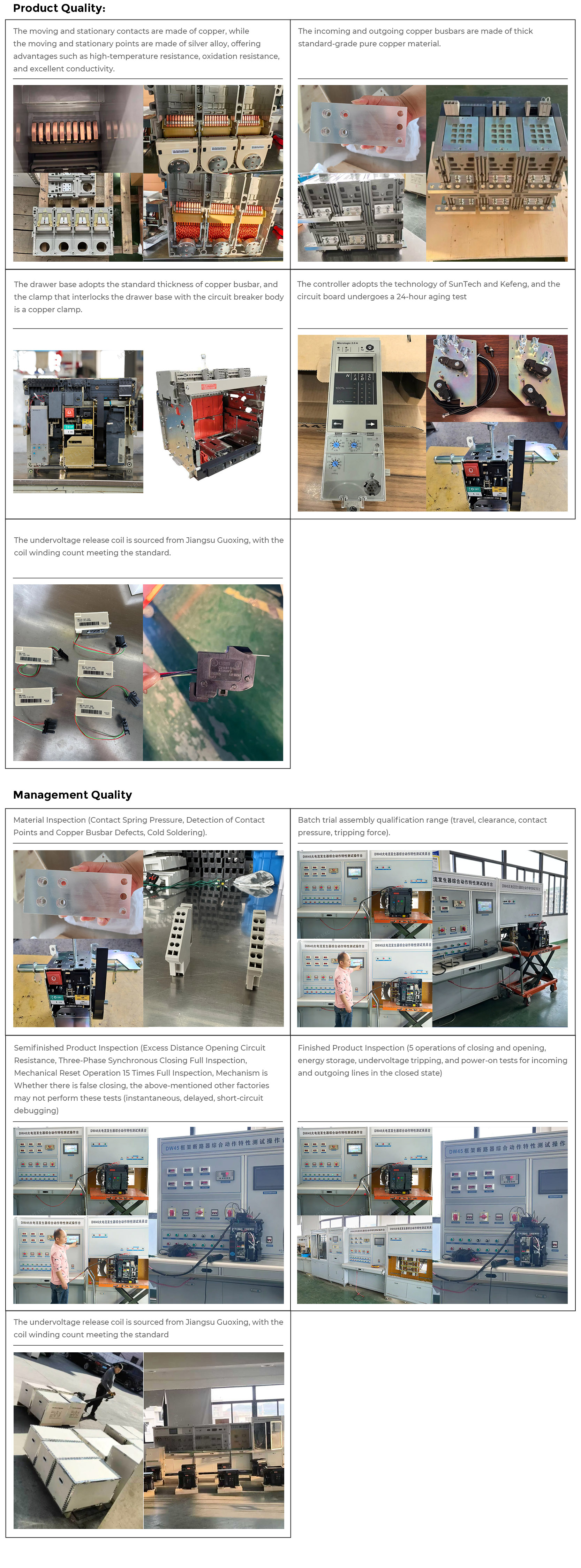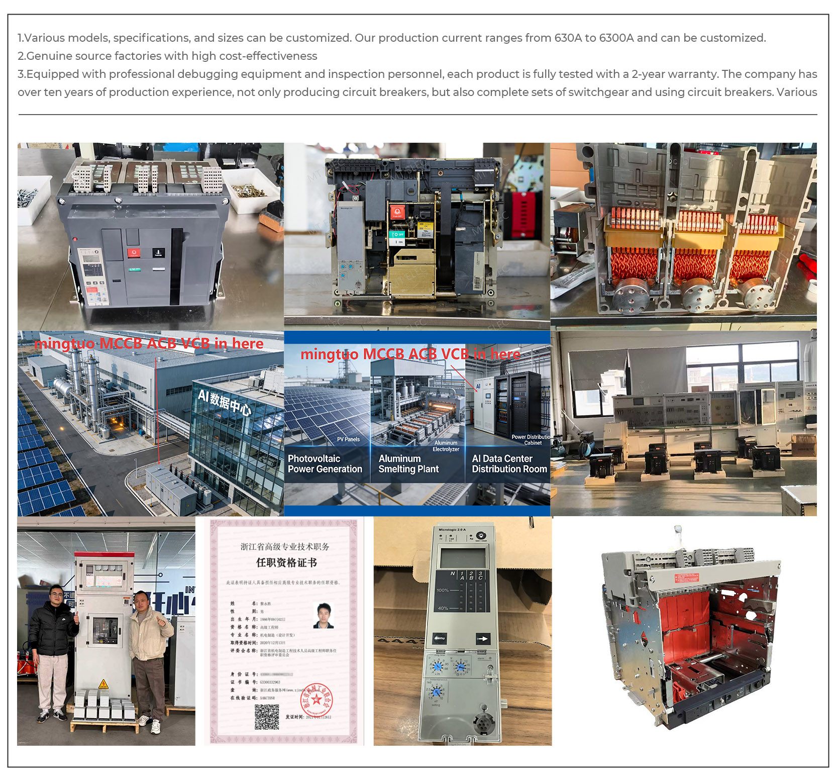 An air circuit breaker (ACB) operates by automatically interrupting current flow upon detection of overload or short-circuit. Under normal conditions, its main contacts remain closed to allow unobstructed current flow. When sustained overcurrent occurs, the thermal element warps from heat accumulation, triggering the tripping mechanism. In sudden short-circuit events, the solenoid coil produces an instantaneous magnetic force to activate the tripping mechanism. This action rapidly separates the main contacts, generating a strong electric arc that is immediately directed to the arc-extinguishing chamber. There, the arc is split, cooled, and extinguished, safely disconnecting the circuit and preventing system damage.