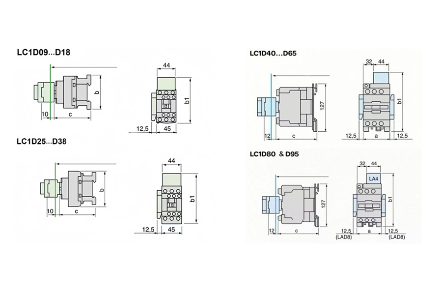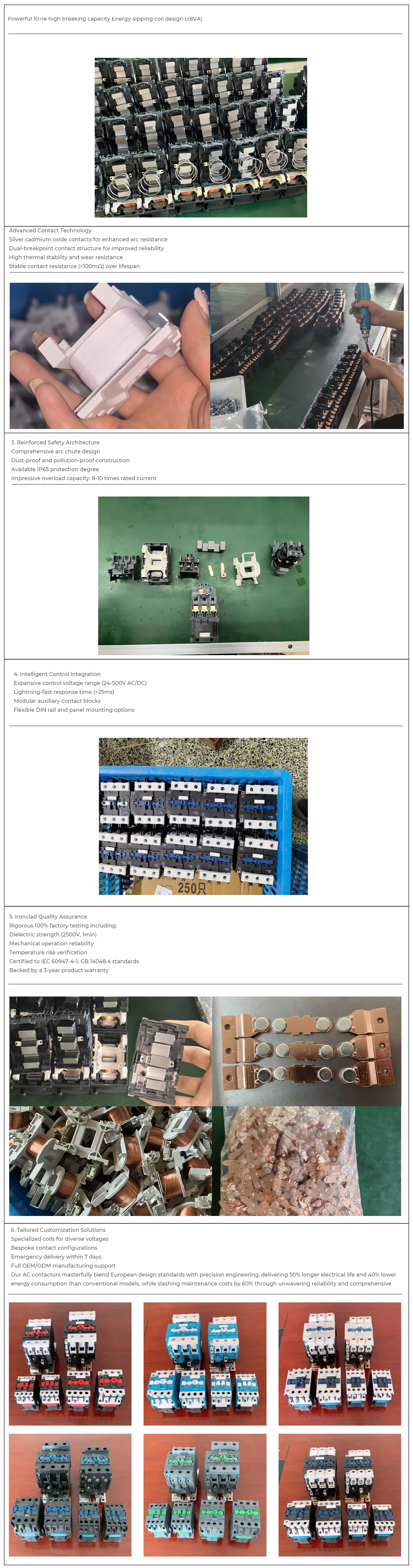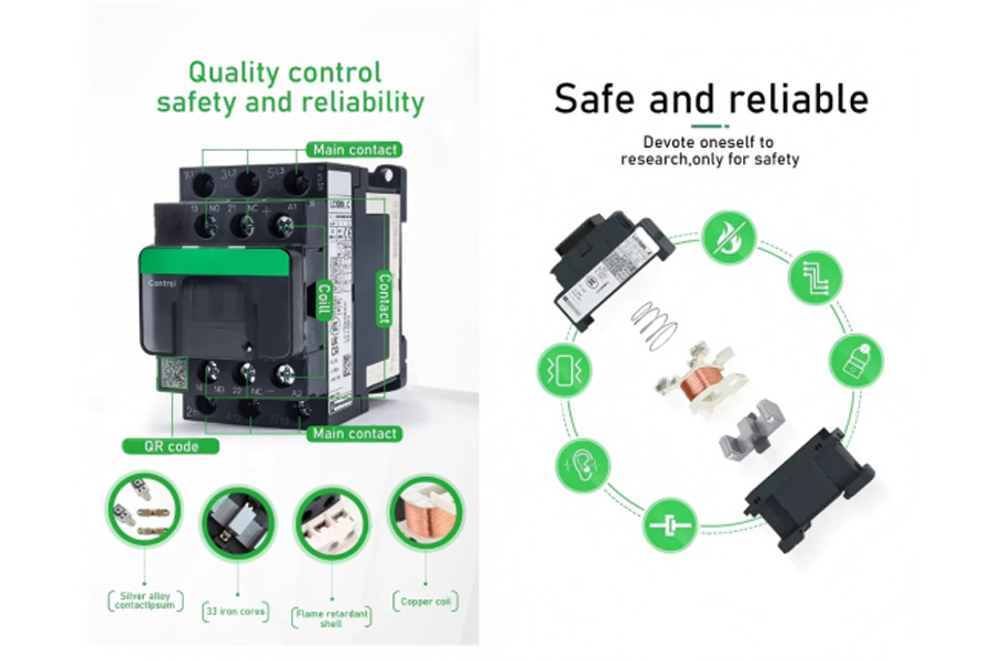 Working Principle:When the AC contactor is powered on, the internal coil will generate a magnetic field, causing the moving iron core and the stationary iron core to be attracted together, driving the contact system to contact the stationary contact and conducting the circuit. After the coil loses power, the suction force disappears, and the reset spring will push up the moving iron core, causing the contacts to separate and the circuit to break.