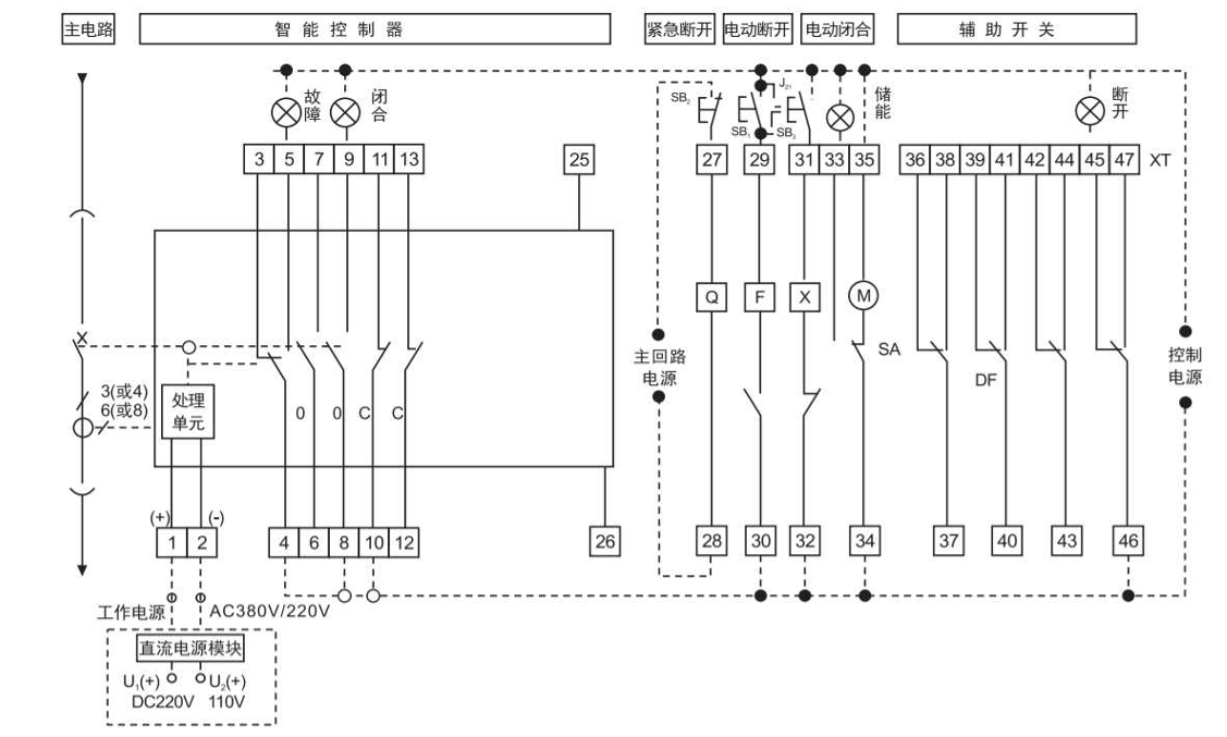 When the product is in the closed and powered on state, if there is overload or short circuit, undervoltage or phase loss in the circuit, the current transformer in the ACB will detect the current signal, which will be transmitted to the controller. The controller will then send a command to the mechanism to trip, causing the dynamic and static contacts to separate and disconnect, and the product will open, achieving the function of protecting the backend load.