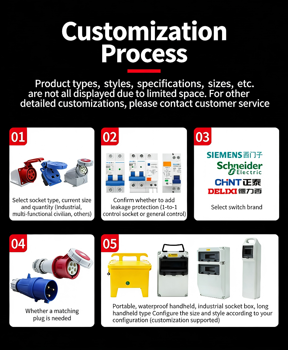 Outdoor waterproof socket boxes are used in outdoor construction sites, factories, and places with high requirements for sealing, waterproofing, and dust prevention. They can provide temporary power to the loads on the construction site, making it convenient and portable to provide. They are equivalent to a mobile power source and can output three-phase and two-phase electricity. They can be customized to provide various power sources and power sockets in various styles and shapes according to the actual needs of the construction site.