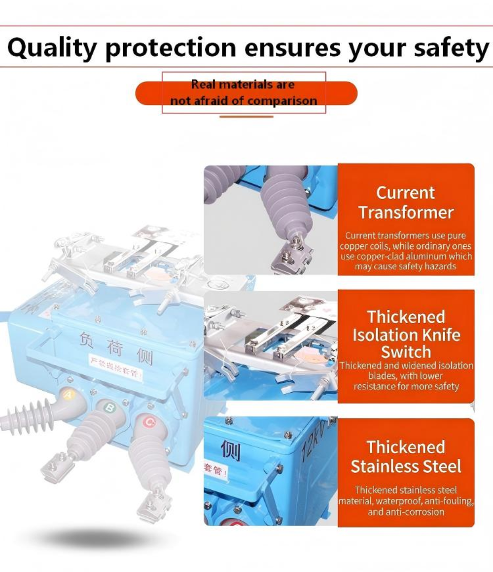 When there is overcurrent or short circuit in the outgoing line of the circuit, the current transformer can detect the current signal, which is transmitted to the controller. The controller issues a command to trip the mechanism, which drives the dynamic and static contacts inside the vacuum tube to separate, thereby achieving disconnection and cutting off the circuit, playing a protective role.